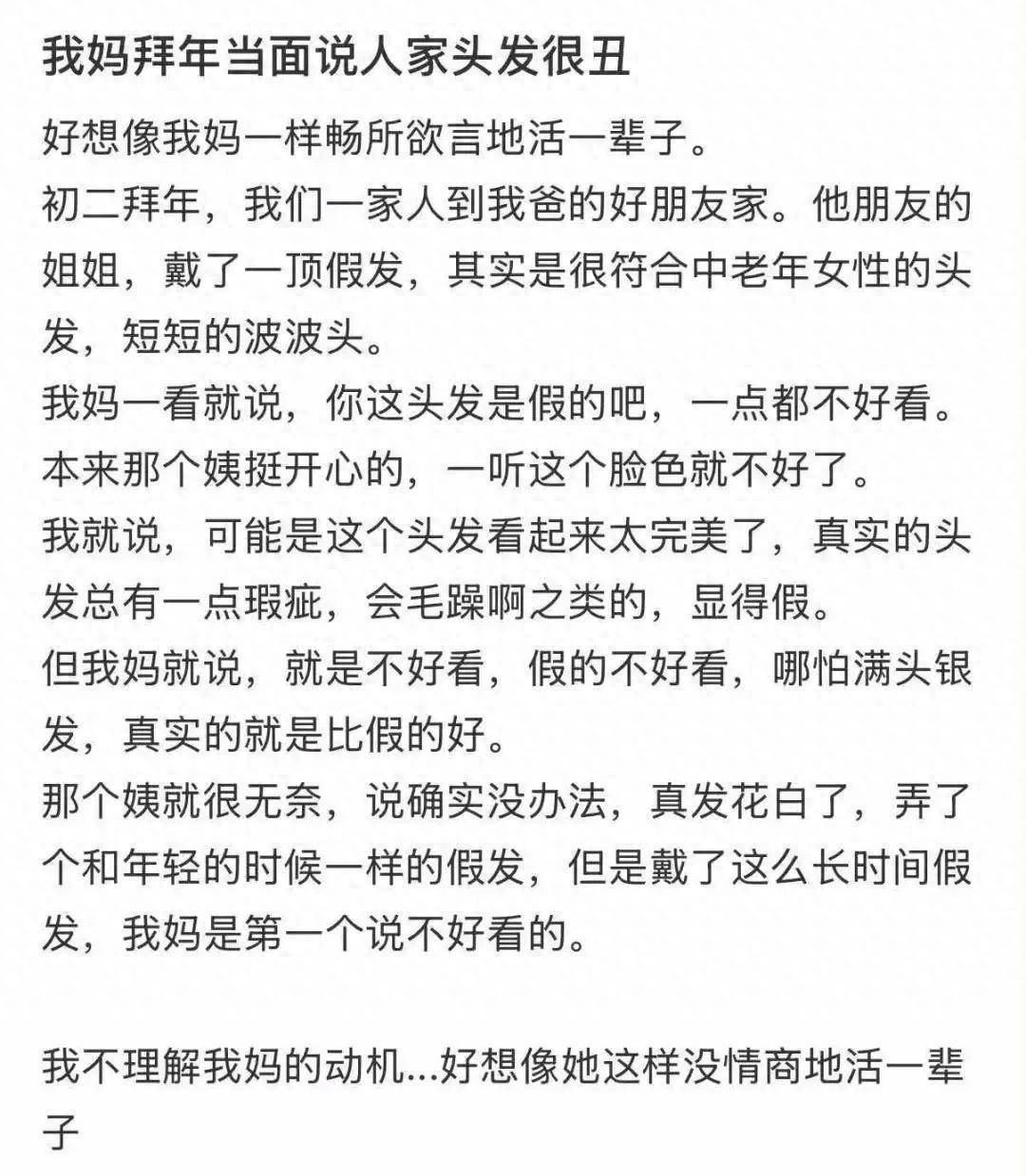 帖主在最后写道:“我不理解我妈的动机……好想像她这样没情商地活一辈子。”